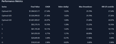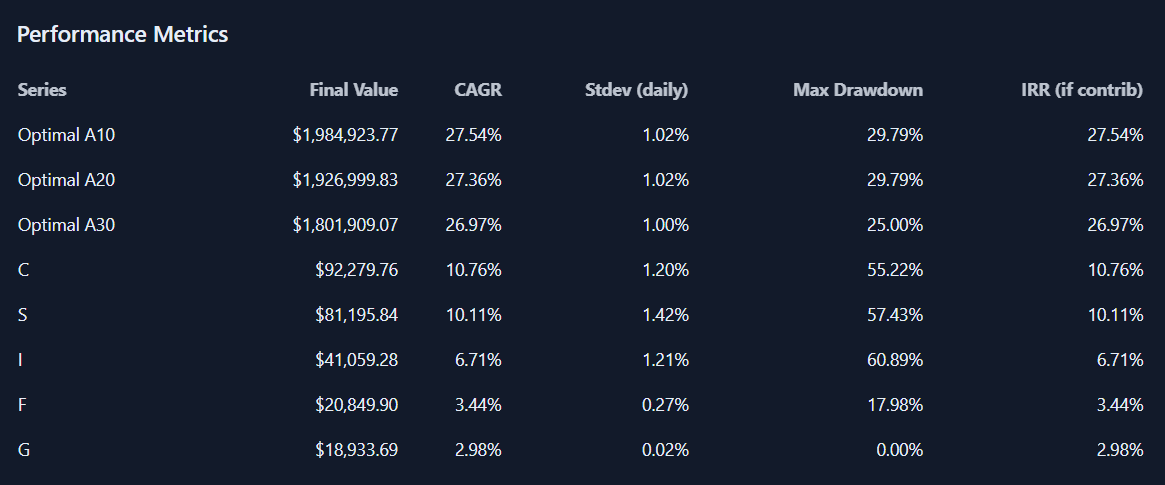 The Performance Metrics shows a 20 year backtest chart of the three Optimal A strategies vs the Core TSP funds with an initial $10,000 investment.