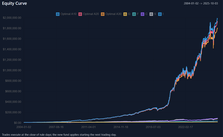 Seasonality Strategies: Apex Equity offers three premium, calendar-based strategies—Optimal A10, A20, and A30—designed specifically for TSP investors. Over a 20-year backtest, each strategy has consistently outperformed all core TSP fund allocations, delivering higher cumulative returns with lower maximum drawdowns. These models are built on historical seasonality patterns, offering disciplined execution without the guesswork.